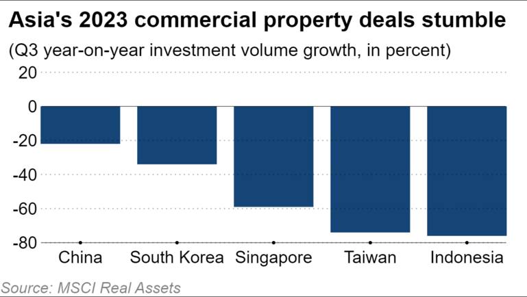 Market data provider MSCI Real Assets said commercial property deals in the Asia-Pacific fell 37% compared with the third quarter of 2022, marking a sixth consecutive quarter of year-on-year declines. The share of Asia-Pacific acquisitions by global investors approached all-time lows of 6%.